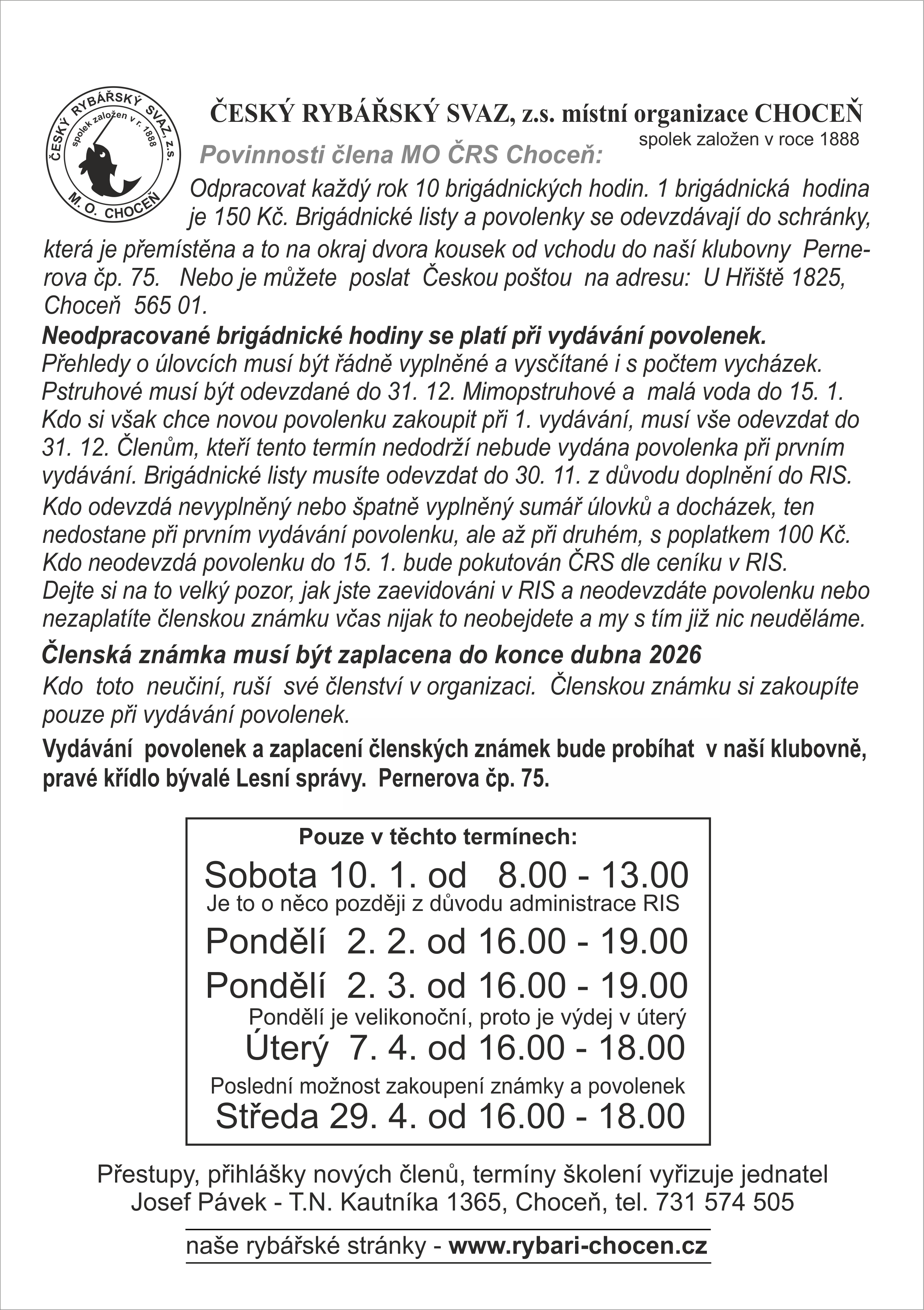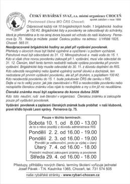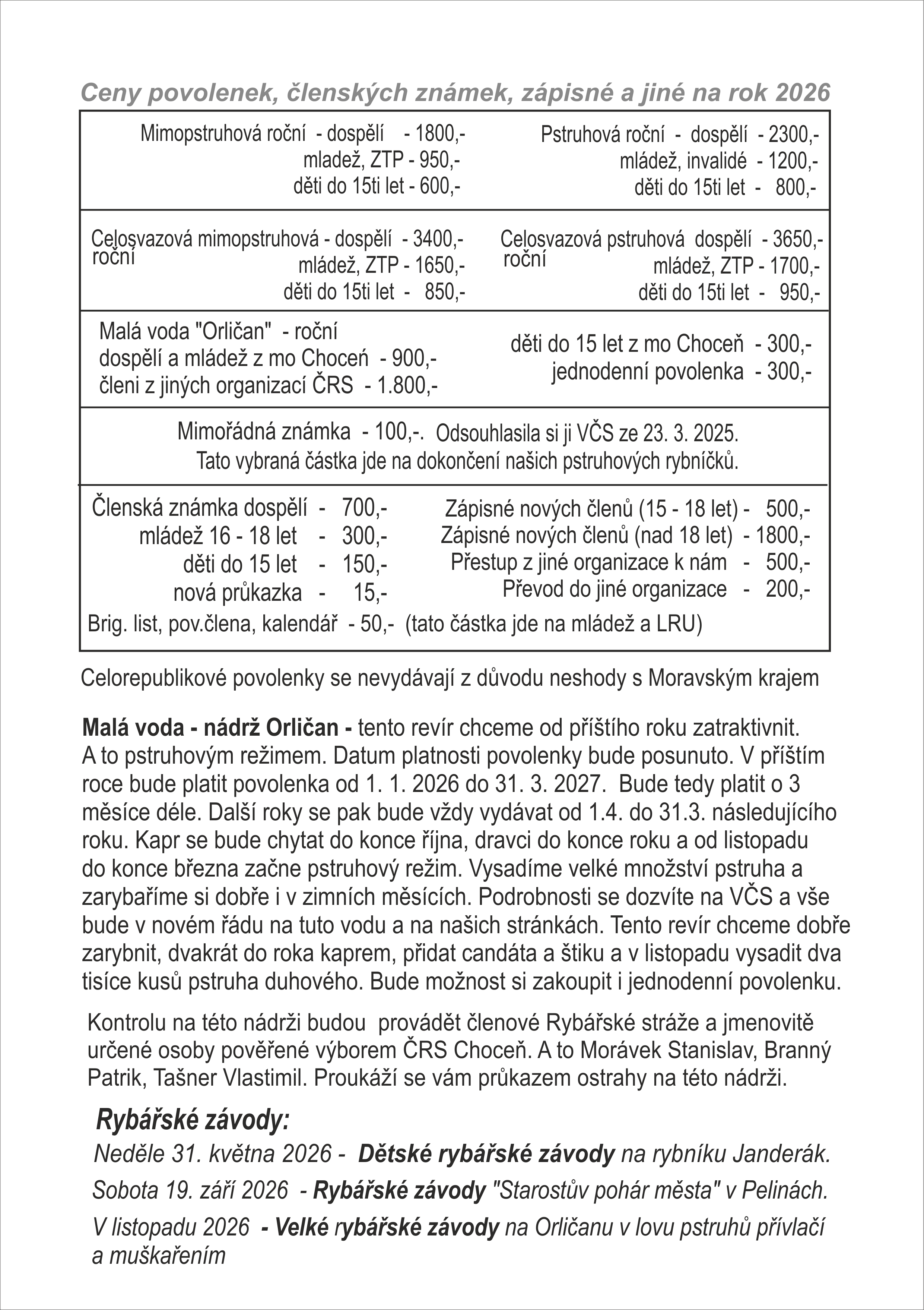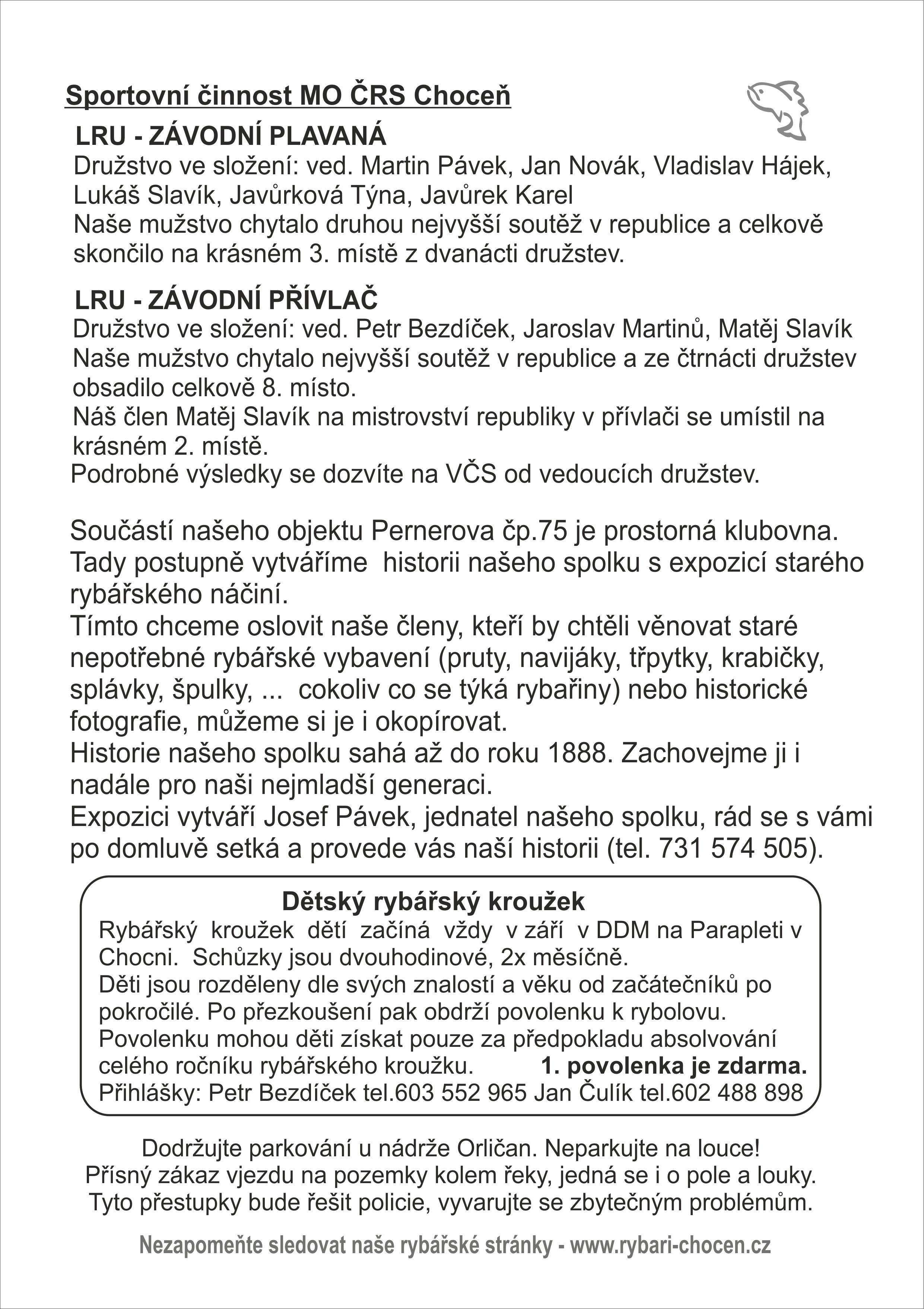 Brigády dětské historie MO ČRS Choceň Orlice Tichá Povolenky Rybářský lístek Vysazení ryb Zpravodaj Závody Členská schůze Školení